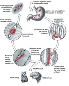 In aceste conditii larvele se hranesc cu exsudat cellular si continut intestinal, dezvoltandu-le rapid. Larvele vii encapsulate trec neafectate prin stomac si urmeaza aceeasi cale de dezvoltare.