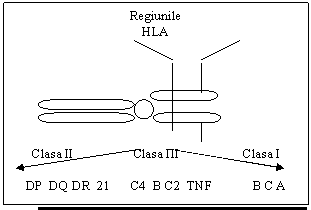 Modul de transmitere genetica: este necunoscut, nici transmiterea dominanta, nici cea recesiva neputand fi sustinuta. S-a demonstrat o interactiune stransa intre factorii de mediu si bagajul genetic, dar si natura poligenica a afectiunii. Peste 20 de gene sunt responsabile de dezordinile ce pot sa apara in diabet. Acestea sunt gene de susceptibilitate care, prin definitie, cresc sau modifica riscul de boala. Genele de susceptibilitate nu sunt nici necesare nici suficiente pentru ca boala sa apara.. Prevalenta DZ tip 1 este de 30-50 % la gemeni, de 20 % la fratii sau surorile cu antigen HLA identic, de 5% la fratii si surorile haploidentici, de 1 % la fratii si surorile neidentice. Riscul de a dezvolta diabet este mai mare la copiii din tata diabetic (8,6%) decat la copiii din mama diabetica (3%). Riscul de a face diabet in cursul vietii pentru rudele de gradul unu ale unui diabetic este de 5-8 %, functie de haplotipurile HLA. Antigenele leucocitare umane (HLA- Humane Leukocyte Antigen) - sunt controlate de pe bratul scurt al cromozomului 6. Aceasta regiune include clasele I, II, III. Genele din clasa I sunt exprimate in toate celulele nucleare si servesc ca antigene clasice la transplant. Aceste proteine reprezinta peptide antigenice la celulele CD8T. Clasa II de gene duce la expresia restrictiva a unor antigene la nivelul celulelor b, macrofagelor, celulelor dendridice si functioneaza prin prezentarea peptidelor catre celulele CD4T. Produsii clasei III de gene include proteinele complementului (ex. B, C2 si C4) si tumor necrosis factor. ( Figura 7).Figura de mai jos reprezinta secventele genetice care codifica sinteza unor polipeptide, care alcatuiesc moleculele HLA. situate pe membranele celulare si care initiaza si/sau amplifica raspunsul imun, dar asigura printr-o colaborare complexa cu macrofagele si limfocitele si toleranta imunologica pentru sructurile proprii (self).
