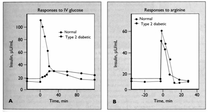 Figura 13 Secretia insulinica in diabetul zaharat tip 2 comparata cu persoanele nediabetice, dupa stimularea cu glucoza i.v.(a) si dupa stimularea cu arginina,