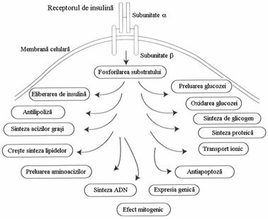 Insulina actioneaza in tesuturile periferice prin intermediul receptorilor insulinici. Pentru a se media actiunea insulinei este necesara fosforilarea proteinelor. Insulina stimuleaza turnoverul glucozei, favorizand transportul glucozei prin membrana plasmatica, urmat de catabolizarea oxidativa sau nonoxidativa a acesteia, ultima fiind asociata cu sinteza de glicogen. Trans-portul intracelular al glucozei are loc mediat de insulina numai in muschii scheletici, celulele adipoase si inima. Insulina stimuleaza sintezele proteice in aproape toate tesuturile. Insulina are un efect mitogenic, efect mediat prin cresterea sintezei ADN si prevenirea mortii celulare programate sau apoptozei. Ea stimuleaza transportul ionilor prin membrana plasmatica a numeroase tesuturi. Insulina stimuleaza sinteza de lipide in celulele grase, muschii scheletici si ficat; ea previne lipoliza, inhiband lipaza hormonsensibila. Exista tot mai multe dovezi pentru o actiune directa a insulinei prin receptorul de insulina , in reglarea eliberarii de insulina de catre celula b. S-au identificat peste 100 de mutatii ale receptorului insulinic.Aceste mutatii apar pe toata lungimea receptorului. Pacientii cu mutatii la nivelul receptorilor prezinta de obicei insulinorezistenta severa, cum ar fi leprechaunismul, insulinorezistenta tip A si acanthosis nigricans sau sindromul Rabson -Mendenhall