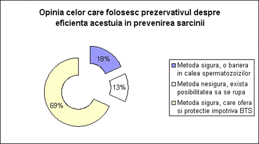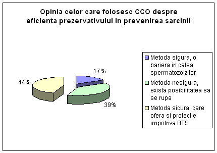 Din graficele de mai sus reiese ca protectia impotriva BTS pe care o ofera prezervativul pe langa protectia impotriva sarcinii, este recunoscuta ca un avantaj important de cei care folosesc CCO (44%) si mai ales de cei care folosesc prezervativul (69%). Procente foarte apropiate, 17%, respectiv 18%, il considera eficient pentru ca reprezinta un obstacol on calea spermatozoizilor. Se observa , insa, o importanta diferenta de opinii in ceea ce priveste nesiguranta prezervativului prin posibilitatea de a se rupe:13% dintre cei care folosesc prezervativul si 39% dintre cei care folosesc CCO. Acest motiv, probabil ca este suficient pentru multe dintre ele , sa aleaga CCO.