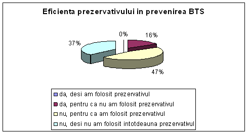 In ceea ce priveste eficienta prezervativului in prevenirea BTS, constatam o eficienta maxima, evidentiata prin faptul ca nici o persoana (0%) nu a contactat o BTS daca a folosit corect prezervativul, iar 16% au declarat ca au contactat o BTS din cauza ca nu l-au folosit.