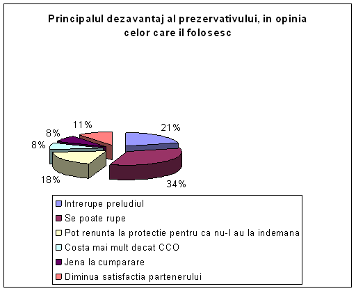 In opinia celor care folosesc prezervativul, jena la cumparare si costul reprezinta dezavantaje pentru procente mici din lotul studiat; cel mai important dezavantaj este ca se poate rupe(34%), urmat de intreruperea preludiului(21%) si renuntarea la protectie cand nu este la indemana(18%).