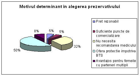 Motivul determinant in alegerea prezervativului este clar: protectia impotriva BTS. Acest lucru se datoreaza constientizarii pericolului acestor boli sau faptului ca aceste membre ale lotului studiat nu au o relatie stabila.. 32% au ales prezervativul in defavoarea CCO pentru ca acesta nu necesuta recomandarea medicului, iar procente mici, de 5%, l-au ales pentru ca pretul este rezonabil sau exista numeroase puncte de comercializare.