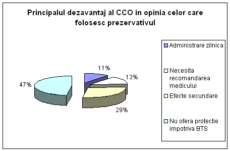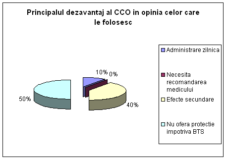 In ceea ce priveste principalul dezavantaj al CCO, parerile sunt apropiate in cele doua grupuri (care folosesc CCO si care folosesc prezervativul): acesta este lipsa protectiei fata de BTS la 50%, respectiv 47%, urmat de efectele secundare (40% respectiv 29%), administrarea zilnica (10% respectiv 11%).