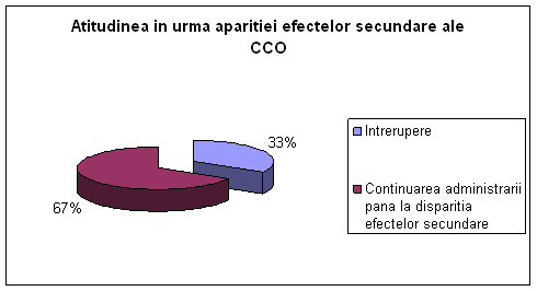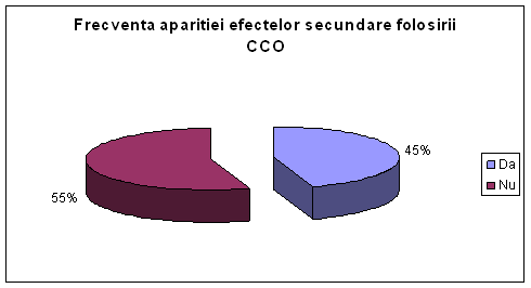 Acestea sunt principalele avantaje pentru care sunt alese CCO, desi efectele negative secundare administrarii CCO apar aproximativ la jumatate dintre persoanele chestionate care le folosesc (45%). In majoritatea cazurilor (67%), aceste persoane au continuat administrarea pana la disparitia efectelor secundare si numai o treime au renuntat.