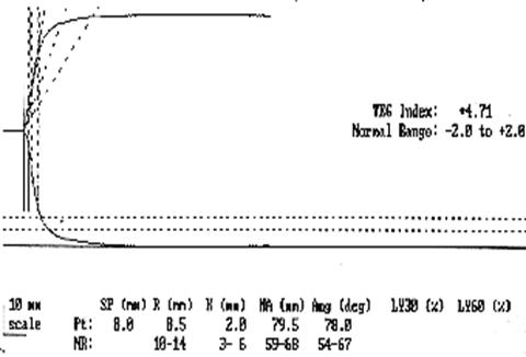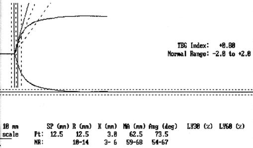 In figura 7.8. este redat aspectul grafic normal al unei trombelastograme obtinuta cu trombelastograful computerizat.