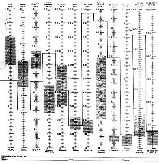 Fig.7.18. - Exemplu de buletin biochimic obtinut cu un analizor automat (raportarea la valorile de referinta in acest caz este extrem de facila, scalele fiecarui parametru listat fiind intersectate in dreptul valorilor obtinute in momentul testarii)
