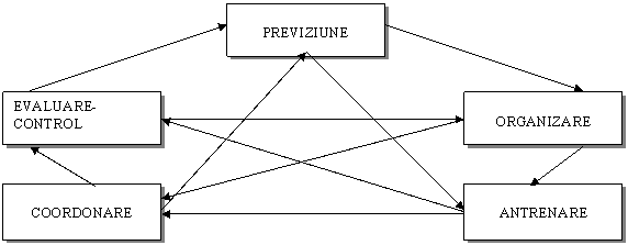 Putem vorbi astfel de functia de previziune, care are in vedere obiectivele, programarea muncii, dezvoltare etc. si se realizeaza prin intermediul diagnozei, prognozei, planificarii si programarii productiei. Functia de organizare, care asigura stabilirea sarcinilor pe baza rationala, stabilirea legaturilor de autoritate, de cooperare si de informare ce unesc oarnenii in cadrul sistemului; functia de coordonare definita prin adaptabilitatea organizatiei la conditiile existente in fiecare moment; functia de antrenare care se refera la modul de comanda si la motivarea personalului si functia de control prin intermediul careia se realizeaza evaluarea rezultatelor prin masurarea realizarilor, compararea acestora cu obiectivele stabilite si surprinderea elementelor pozitive si negative.