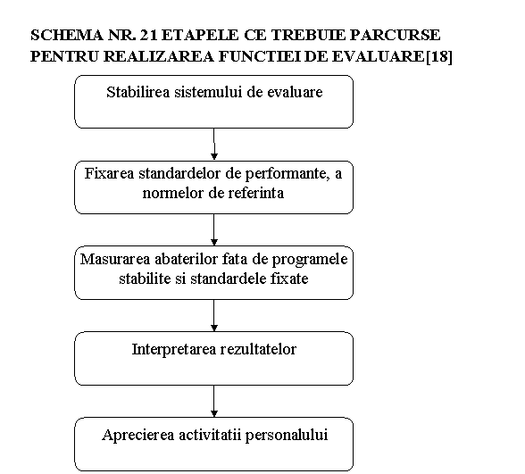 Prin control, performantele unui sistem si al componentelor acestuia sunt comparate cu obiectivele, pe baza anumitor criterii si standarde stabilite initial, in vederea preitampinarii aparitiei de disfunctionalitati si a eliminsrii deficientelor constatate. Realizarea functiei de evaluare presupune patru actiuni specifice, succesive: