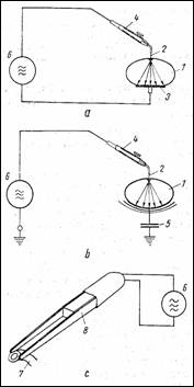 Principiul electrochirurgiei este prezentat in Figura 4.7, in care: (a) sistem monopolar cu electrod neutru; (b) sistem monopolar fara electrod neutru; (c) coagulare bipolara. In figura, 1 este tesutul, 2 - electrodul activ, 3 - electrodul neutru, 4 - piesa auxiliara avand comutatorul modului de lucru, 5 - capacitate parazita, 6 - generator de inalta frecventa, 7 - vas de sange, 8 - penseta bipolara. Electrodul activ este realizat din cauciuc conductor sau otel inoxidabil si el poate avea forma de cutit, scalpel, sfera, ac sau bucla.