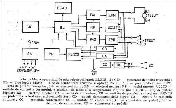 Aparatele de electrochirurgie pot fi de putere mica (< 50 W), medie (50.150 W) sau mare (150.400 W). Un astfel de aparat de productie indigena este prezentat in Figura 4.9 ( Gli88