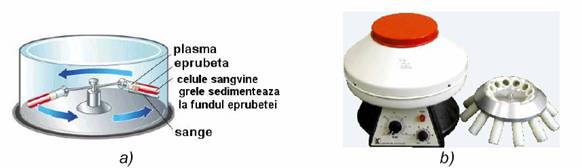 Fig. 3 a) Pozitionarea eprubetelor in centrifuga in miscare; b) Centrifuga de laborator