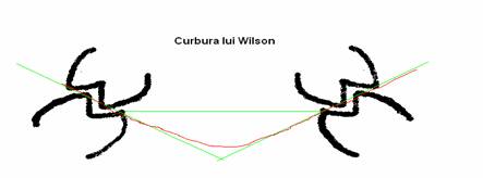 curbura lui Wilson prelungita la nivelul liniei mediane formeaza un unghi cu varful in jos. Aceasta se datoreaza pozitiei cuspizior P si V mandibulari care sunt implantati intr-o pozitie mai inalta fata de cuspizii de echilibru sau de ghidaj.