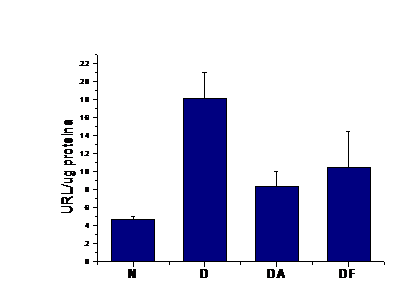 La sfarsitul perioadei studiu, sorecilor li s-a recoltat sangele si au fost sacrificati. Sangele recoltat a fost centrifugat si am izolat serul. Glicemia a fost determinata in serul fiecarui animal din cele patru grupe experimentale cu ajutorul unui kit (Dialab) de determinare a glicemiei. Dupa cum putem observa in figura V.1. glicemia grupului de soareci injectati cu streptozotocina (D) este de doua ori mai mare decat a grupului de soareci normali. Tratamentul soarecilor diabetici cu fenofibrat (DF) nu are efct asupra glicemiei serice. In contrast, tratamentul cu aspirina, timp de o luna, induce o reducere semnificativa a glicemiei serice soarecilor diabetici (DA).