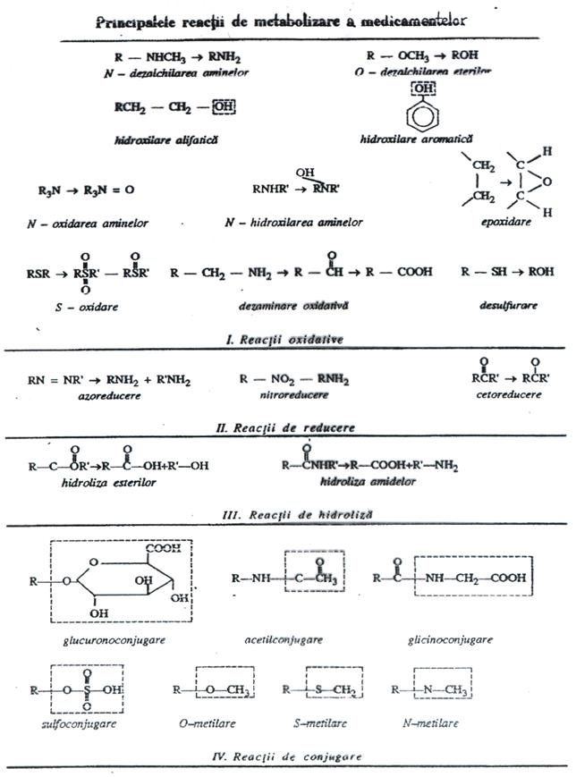 1.3. T r a n s f o r m a r e a b i o c h i m i c a a m e d i c a m e n t e l o r. Multe medicamente se metabolizeaza, adica sufera in organism transformari chimice, care le modifica proprietatile fizico-chimice si biologice. Sunt metabolizati mai ales compusii liposolubili. Metabolitii rezultati rezultati sunt mai polari si au in consecinta o solubilitate mai scazuta in grasimi. Reactiile chimice prin care are loc metabolizarea medicamentelor sunt catalizate enzimatic si sunt de mai multe tipuri: oxidari, reduceri, hidrolize si conjugari (cuplari),