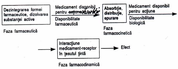 Practic, modificarile ce au loc ca urmare a administrarii unui medicament, atat la nivelul medicamentului, cat si la nivelul organismului asupra caruia actioneaza acesta, se succed conform schemei de mai jos: