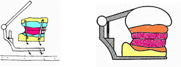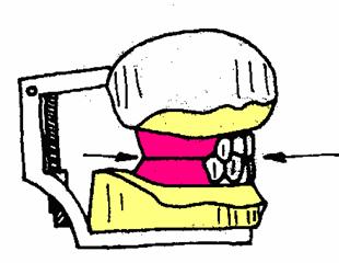 Se aplica pasta de gips pe suprafata bazala a soclului modelului superior si se coboara bratul vertical al articulatorului pana ia contact cu modelul. Gipsul este modelat intr-o forma simetrica, rotunjita, in forma de calota.
