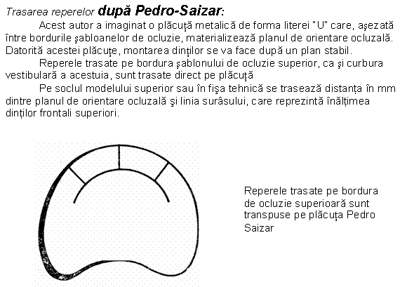 -Curbura vestibulara a bordurii de ocluzie a sablonului superior reprezinta limita fetelor vestibulare a frontalilor superiori. Arcul de cerc al acestei curburi va corespunde arcului de cerc format de unirea fetelor vestibulare ale frontalilor superiori. Aceasta curbura este inregistrata printr-o amprentare cu gips a curburii vestibulare, obtinandu-se o cheie care este repusa pe model dupa indepartarea sabloanelor, fata de care se vor monta dintii frontali. Aceasta amprenta este cunoscuta sub denumirea de "cheie vestibulara". -Trasarea liniilor tangente la varful crestei edentate - aceste linii se traseaza pe suprafata protetica a modelului, dupa indepartarea sabloanelor. Pe modelul superior, corespunzator caninului, este trasat bilateral varful crestei edentate dinspre mezial spre distal pana la tuberozitate. Pe modelul inferior sunt trasate bilateral liniile corespunzatoare crestei edentate pentru zona laterala si linia crestei edentate din zona frontala, care se intersecteaza in dreptul caninilor.Linia curburii crestei edentate inferioare, corespunzatoare molarilor, este trasata de o parte si de alta a soclului modelului inferior, paralela cu profilul varfului crestei. Aceasta linie a curburii crestei il orienteaza pe tehnician in montarea dintilor: fetele ocluzale ale dintilor laterali sunt paralele cu aceasta linie, rezultand curba ocluzala sagitala