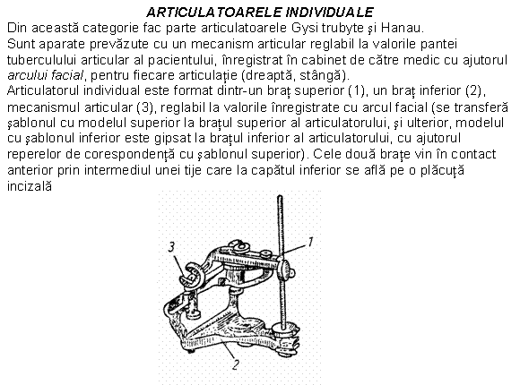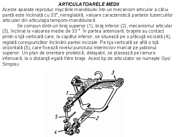 Articularea bratelor se face pe o panta inclinata de diferite valori, ca si panta tuberculului articular. Protezele confectionate cu ajutorul articulatoarelor sunt de mare precizie, deoarece montarea dintilor se face in conditiile prezentei tuturor miscarilor executate de mandibula.