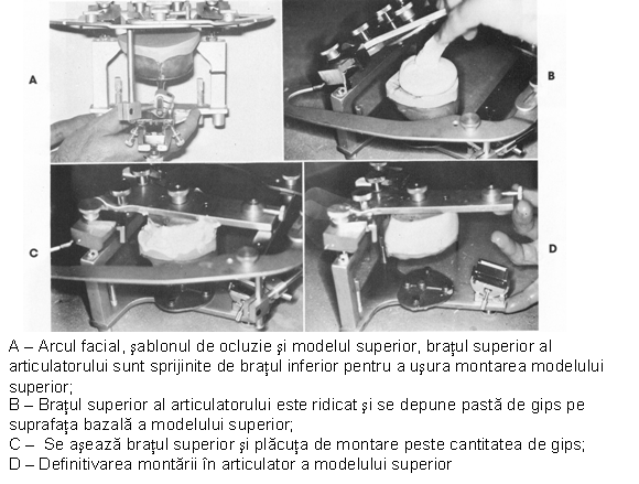Sablonul cu modelul superior se aseaza pe planul cu orientare protetica (suprafata ocluzala a bordurii este in contact cu acest plan), astfel ca linia mediana a modelului sa se suprapuna cu mediana bratului superior, iar punctul interincisiv sa vina in contact cu varful tijei de orientare existenta pe articulator. In aceasta pozitie, bordura de ocluzie a sablonului superior se lipeste cu ceara de planul de orientare protetica.