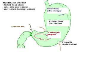 - Dupa evacuarea a 1-3 ml din chimul gastric, pilorul se inchide, iar peristaltica bulbara impinge mai departe continutul in intestinul subtire si impiedica refluxul duodeno-gastric. Evacuarea gastrica este completa dupa 6 -7 ore de la ingestia alimentelor.