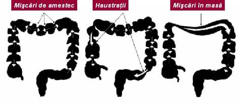 - Contractiile colonului proximal sunt adaptate functiei de absorbtie a apei si de omogenizare a chimului intestinal, in timp ce contractiile colonului distal asigura propulsarea continutului intestinal in rect prin miscari peristaltice si miscari de transport "in masa". In general, activitatea contractila a colonului este lenta si se caracterizeaza prin 4 tipuri de miscari: