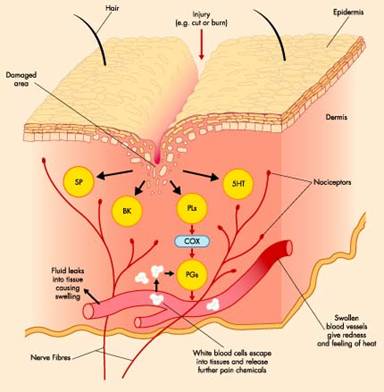 I. Transmiterea mesajului nociceptor si aparitia de reactii locale (vasodilatatie, edem, sensibilizarea terminatiilor nervoase) si generale (transport axonal de substante algogene).