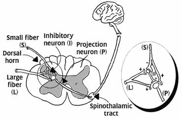 Neurotransmitatorii excitatori sunt: glutamatul si tahikininele (substanta P, neurokininele A si B). Neurotransmitatorii inhibitori sunt reprezentati la nivelul maduvei spinarii si al sistemului nervos central de catre acidul gama-aminobutiric (GABA). GABA mediaza controlul "portii" in cornul dorsal prin sinapse cu neuronii care contin substanta P.