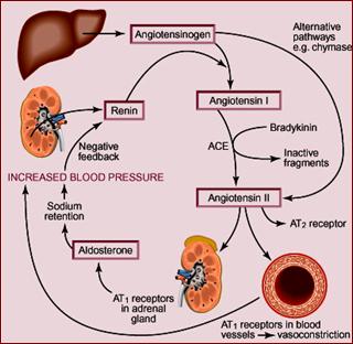 Nivelele crescute de factor natriuretic atrial, kalikreina, prostaglandine vasodilatatoare si oxid nitric, se pot opune efectelor de activare a sistemului renina - angiotensina.