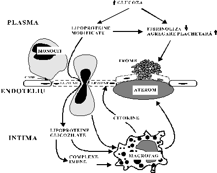 In concluzie, in diabet nivelul crescut al glicemiei determina tulburari in metabolismul lipoproteinelor si al interactiunii celula - lipoproteine. Aceste modificari contribuie la accelerarea aterosclerozei la pacientii diabetici. Cresterea nivelului glucozei plasmatice determina glicozilarea neenzimatica a lipoproteinelor si intensificarea susceptibilitatii la procesele oxidative. Aceste modificari ale lipoproteinelor scad fibrinoliza si cresc agregabilitatea plachetara contribuind astfel la intensificarea proceselor trombotice la diabetici. Lipoproteinele modificate lezeaza celulele endoteliale ale intimei peretelui arterial si determina exprimarea moleculelor de adezivitate celulara. Adeziunea monocitelor la stratul de celule endoteliale si migrarea acestora sub endotelial fiind o consecinta a exprimarii acestor molecule. Lipoproteinele glicate si oxidate din stratul intimal pot fi in continuare modificate prin procese oxidative rezultind astfel lipoproteinele glico-oxidate. Aceste lipoproteine, stimuleaza sistemul imun cu formare de anticorpi. Complexele imune astfel rezultate sunt preluate de macrofage si stimuleaza formarea de colesterol esterificat determinind aparitia celulelor 'spumoase' si eliberarea de citokine. Citokinele rezultate din aceste procese pot leza mai departe endoteliu autointretinind astfel, acest cerc vicios.