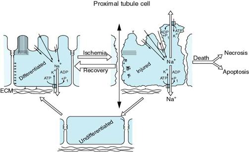 In faza de initiere a NTA are loc trecerea de la DRA prerenala la DRA renala prin aparitia unei disfunctii celulare prin deficit de ADP la nivelul celulelor epiteliale tubulare, endoteliale si musculare netede vasculare. Celulele tubulare proximale pierd marginea in perie, polaritatea membranei si jonctiunile intercelulare.