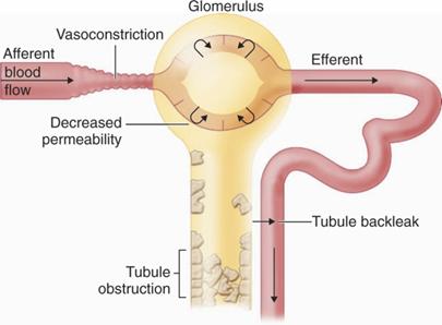 In faza initiala a DRA mecanismele renale de autoreglare corecteaza deficitul de perfuzie renala si mentin rata filtrarii glomerulare (GFR) prin vasodilatatia arteriolelor aferente si vasoconstrictia arteriolelor eferente. In lipsa interventiei terapeutice, aceste mecanisme compensatorii sunt rapid depasite și vasodilatatia arteriolei aferente este inlocuita cu vasoconstrictie si vasoconstrictia arteriolei eferente cu vasodilatatie, iar ischemia progreseaza, determinand reducerea GFR si leziuni tubulare. Aparitia modificarilor tubulare transforma DRA prerenala in DRA intrinseca.