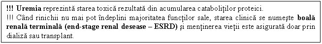Prin catabolismul proteic rezulta aminoacizi, uree si alti compusi potential toxici, care trebuie excretati. Proteinele alimentare mai contin si fosfati, sodiu, potasiu, acizi si ioni care trebuie si ei eliminati. In DRC metabolismul azotat este in balanta negativa prin catabolism crescut asociat cu aport scazut. Ureea si alti cataboliti proteici, ionii rezultati din proteinele de depozit se acumuleaza și datorita toxicitatii sistemice determina disfunctia mai multor organe si sisteme.