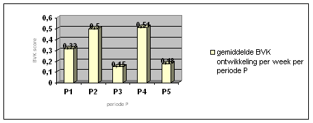 Figura 1 Media BMS de dezvoltare pe saptamana pe perioada P (n=18; P1=perioada initiala, P2=prima perioada de tratament, P3=prima perioada de pauza, P4=a doua perioada de tratament, P5=a doua perioada de pauza)
