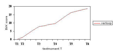 Figura 2. Media progresului dezvoltarii BMS la 18 copii pe timpul a 5 perioade (56 de saptamani), evaluate la 6 momente de test de la T1 la T6
