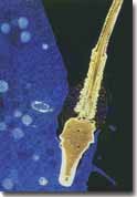 b.) contactul spermatozoidului cu ovulul : cel mai apropiat spermatozoid va penetra ovulul, reactia de cuplare fiind una imunologicǎ ( cu receptorii ovulari ), dar existǎ si o atractie chimicǎ ;