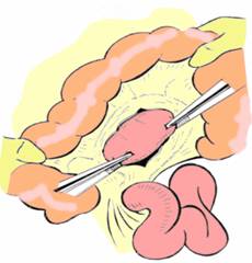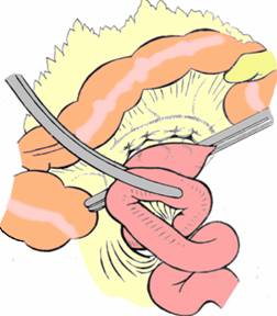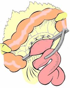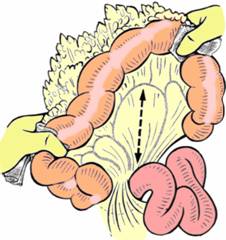Prin bresa creata in mezocolon se abordeaza fata posterioara a stomacului, care este libera sau prezinta aderente laxe ce sunt lizate. Cu o pensa en coeur sau cu o pensa anatomica se prinde fata posterioara a stomacului cat mai aproape de pilor si se trage prin bresa mezocolica (Fig. 3).