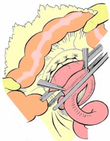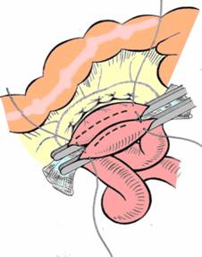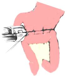 Fig. 9 - GEA precolica cu staplerul: realizarea anastomozei cu ajutorul staplerului linear