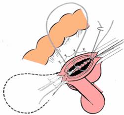 Fig. 3 - Se trage un con din fata posterioara a stomacului, prin bresa mezocolica, care se va fixa la bresa cu fire separate de ata (1)