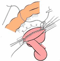 Se incizeaza seromusculara gastrica la 5 mm de surjetul sero-seros, pe o distanta de 6 cm; la nevoie, se realizeaza hemostaza vaselor din submucoasa, apoi se deschide si mucoasa. Se practica o incizie longitudinala la nivelul intestinului, mai scurta decat cea gastrica. Se executa surjetul total posterior, cu catgut 0-0 sau cu alt fir resorbabil, realizand astfel hemostaza pe transa. La nivelul extremitatilor, pentru a intoarce surjetul pe transa anterioara, se trece cu acul dinauntru inafara, pe intestin si dinafara inauntru pe stomac, pentru a realiza o sutura invaginata (Fig. 6).