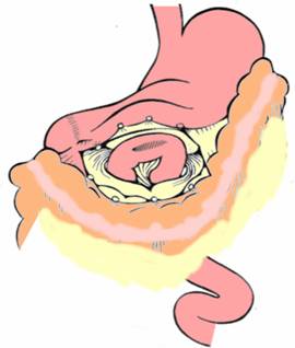 1. Gastroenteroanastomoza transmezocolica posterioara executata pe cale supramezocolica - varianta Toupet-Duval, se realizeaza supramezocolic, varianta folosita cand stomacul este fix. Pentru aceasta, prin ligaturi succesive ale epiploonului gastro-colic in afara marii curburi, se patrunde in cavitatea retrogastrica. Se evidentiaza mezocolonul transvers si se creeaza o bresa de 10-15 cm intr-o zona avasculara. Se trage prima ansa jejunala prin bresa mezocolica in etajul abdominal superior, apoi colonul transvers se reintroduce in abdomen (Fig. 7).
