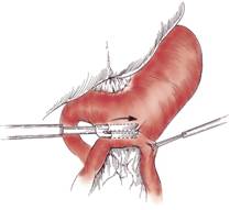 Primul fir care se trece este cel de la extremitatea stanga, care incarca marginea antimezenterica a jejunului si apoi stomacul adiacent. Se practica un nod intracorporeal, apoi firul se sectioneaza. Se creeaza doua orificii prin care se introduc bratele staplerului Endo-GIA. Sunt necesare doua aplicari ale staplerului, gura avand o lungime de 6 cm (Fig. 11). Este important sa se verifice daca intre peretele anterior si peretele posterior al gastrojejunostomiei nu exista punti de mucoasa (10% din cazuri), care trebuie sectionate cu foarfecele. In final, se inchid orificiile prin care a fost introdus staplerul.