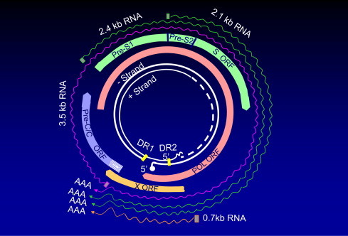Din acest motiv, replicarea virala care are nevoie de o etapa initiala de transcriptie a ARNm pregenomic viral, are loc preferential la nivelul hepatocitelor. Legarea factorului de transcriptie la secventa "core promoter" permite transcriptia a doua secvente lungi a ARNm (3.5 kbaze).