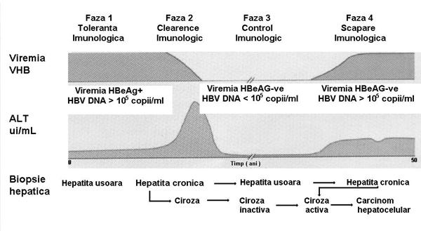 Infectia VHB evolueaza in doua faze. In timpul fazei poliferative ADN VHB este in forma episomala, cu formarea virionilor completi si toti antigenii asociati. Expresia la suprafata celulara a AgHBs si AgHBc in asociere cu moleculele complexului major de histocompatibilitate (MHC) de clasa I duce la activarea limfocitelor T citotoxice (CD8) si distrugerea hepatocitelor.