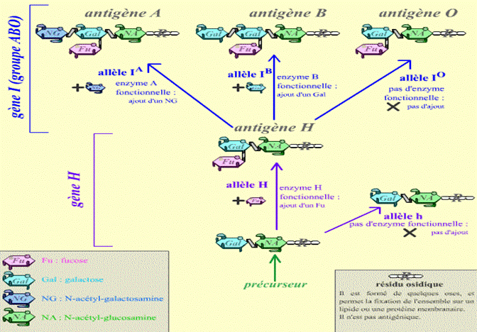 Grupul sangvin O este determinat de gena l, o gena recesiva. Grupele A si B sunt determinate de genele LA si respectiv LB, gene dominante. In cazul acestor grupe sangvine sunt prezente genele LA si l pentru grupul A si LB si l pentru grupul B dar datorita faptului ca gena l este recesiva se manifesta fenotipul (grupul sangvin) determinat de gena dominanta.