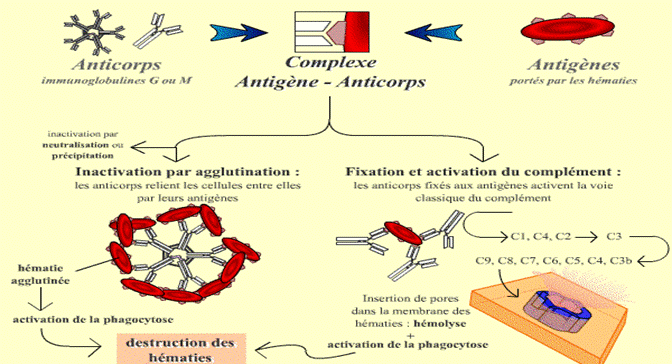La a doua transfuzie cu sange Rh(+), acesti anticorpi vor reactiona cu aglutinogenele Rh de pe suprafata hematiilor si vor produce aglutinarea hematiilor si hemoliza lor in prezenta unui factor numit complement.