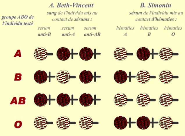 Combinatia dintre cele doua antigene A si B cu aglutininele anti-A si anti-B defineste grupele sangvine in cadrul sistemului ABO.
