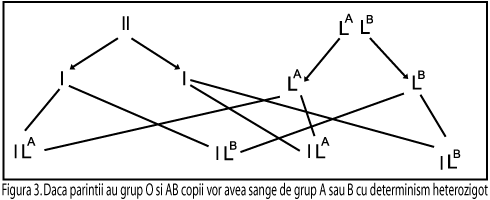 In cazul grupului AB apare un fenomen aparte, denumit codominanta, in care doua gene dominante (in acest caz genele LA si LB) conlucreaza pentru a determina aparitia unui nou fenotip si nu se observa o dominanta a uneia dintre gene asupra celeilalte. In figura este reprezentat un scenariu de transmitere a grupelor sangvine de la parinti cu grup O si respectiv AB, la copii.