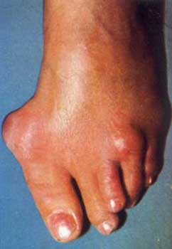 - atacul initial este monoarticular, in 90% de cazuri se afecteaza articulatia metatarso-falangiana a halucelui, apoi urmeaza afectarea uneia din articulatii talocrurala, calcaneana, genunchiul, mina, falangele mainii, cotul;